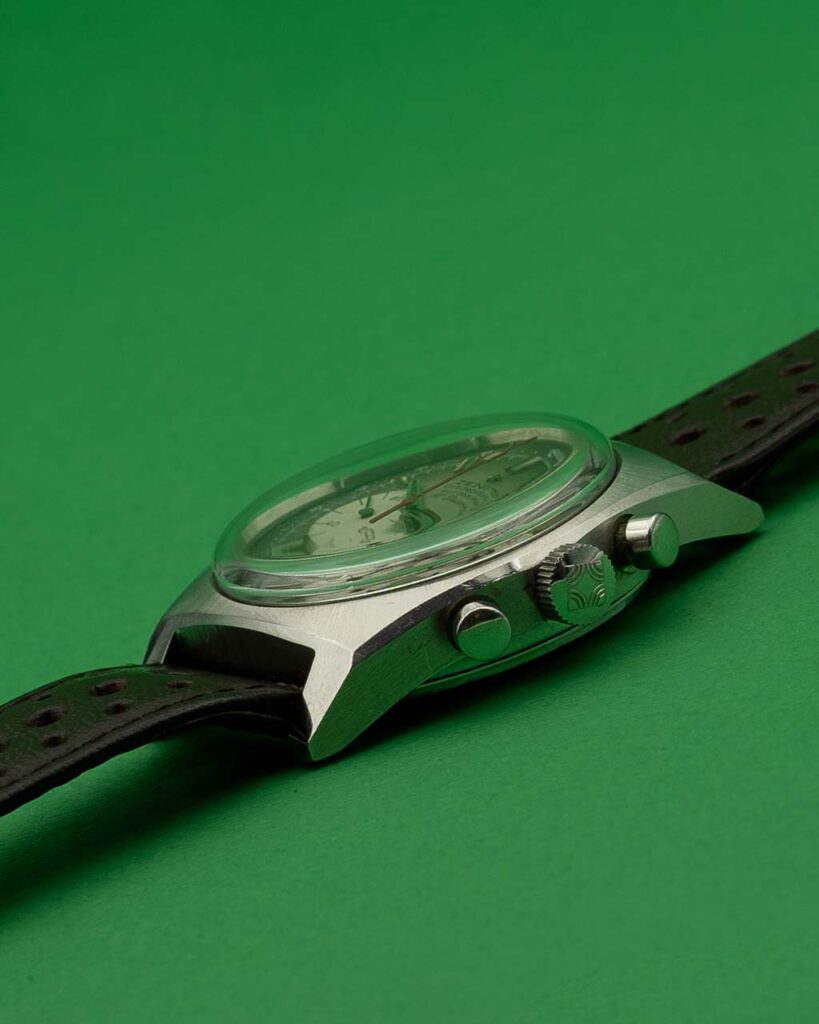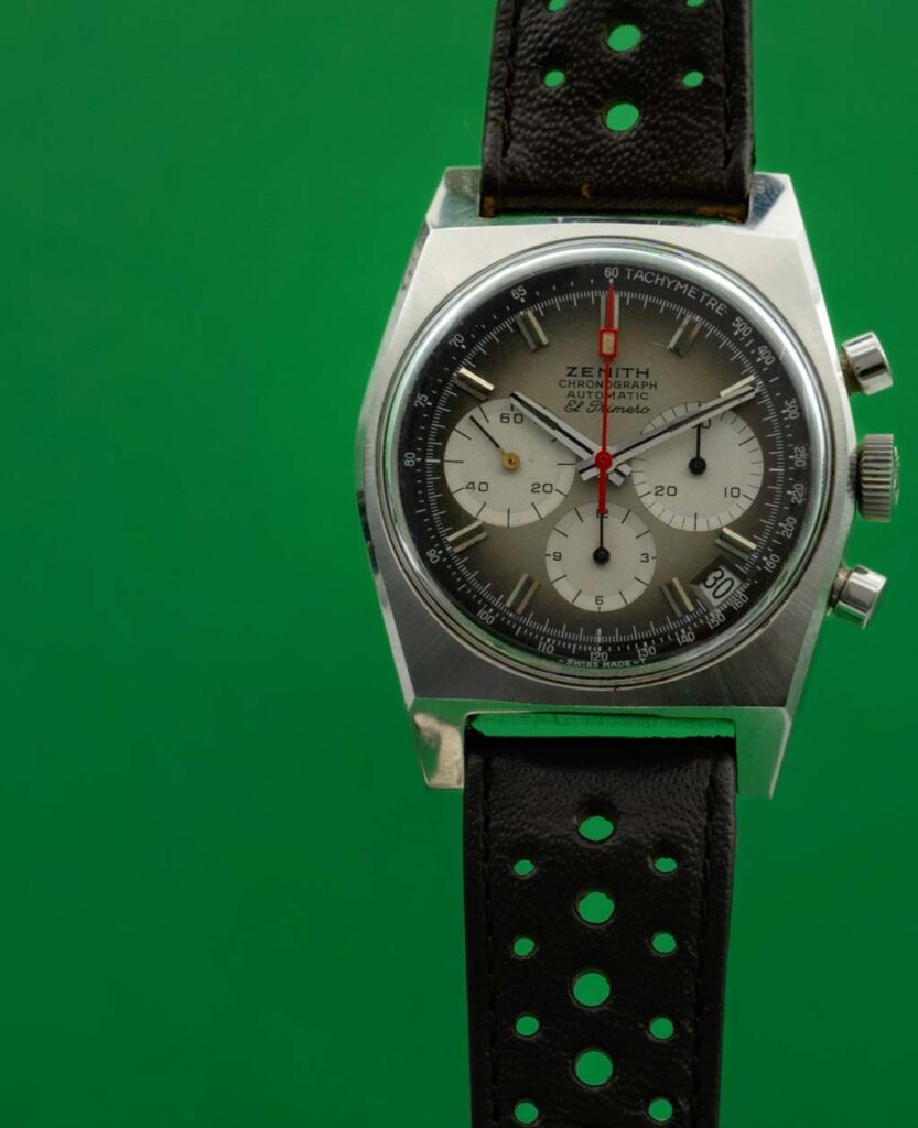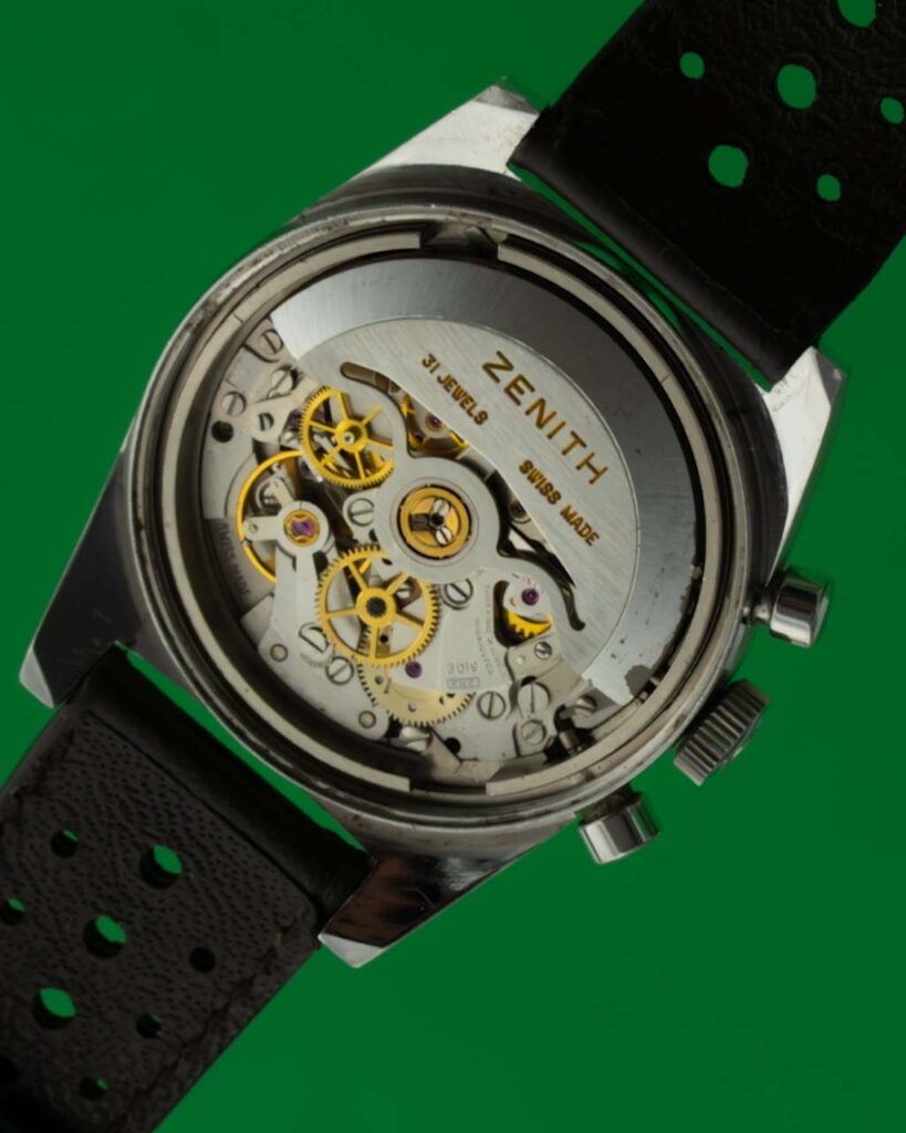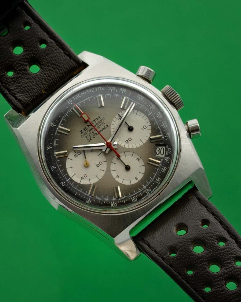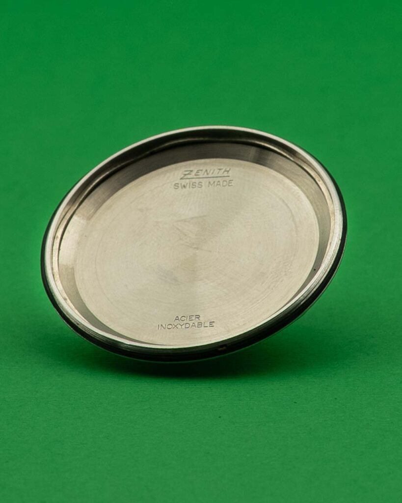 The stainless-steel case is thick and with its original sunburst finish on the top of the case. Dial is in very good condition with no notable damage. It has a later Zenith service crown. It’s in full working order, keeping time and chronograph functions working smoothly